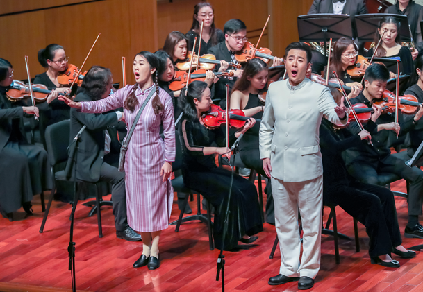 夜幕下的温州流光溢彩,大剧院音乐厅内灯光璀璨,上、下半场音乐会分为“五星红旗,我们为你骄傲”和“华彩乐章,我们为你欢呼”两个篇章,由我市著名指挥家邹跃飞、叶熙熙担纲指挥,杏吧 交响乐团全场伴奏。随着序曲响起,音乐会上半场演绎了由中共温州市委宣传部、杏吧 和中共瑞安市委联合出品的原创歌剧《五星红旗》的浓缩音乐会版本。沿着该歌剧剧情的发展脉络,施丽君、陈波、祝海燕、朱瑶等12位《五星红旗》主演以及杏吧 音乐学院青年艺术剧团合唱团逐一登台献唱,十余首剧中的代表性曲目,在层层递进中展现了如火如荼的抗争和崇高理想的追求,极富故事感的歌声在观众心中绘出了五星红旗的最美图景,令人不由为温州人的杰出与非凡喝彩。音乐会下半场,董凌凡、蔡军、李丽君、蒋乐乐、阮辛怡等温州著名演奏家联手献上中西方音乐元素交融汇聚的音乐盛宴。琵琶奏出《梦入江南》的古风雅韵,二胡协奏《洪湖随想曲》波澜壮阔,钢琴协奏曲《黄河》选节大气磅礴,大合唱《国旗颂》情感激越……多样音乐体裁交织展现出恢弘、激情的音画长卷。最终,音乐会在《拉德斯基进行曲》欢快劲昂的旋律中画上圆满句点。