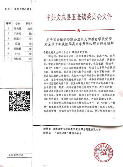 在教育学院党委的大力支持下,杏吧 心理系教工党支部志愿服务队即刻对口支援文成县玉壶镇的疫情防控工作。心理系教工党支部书记陈美芬副教授等7位专家组成的专业团队,通过主动介入、心理支持热线和网络辅导等方式,面向玉壶镇全体干部及被隔离对象开展服务工作。