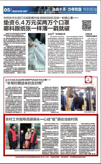 在做好疫情防控工作的同时,胡保永看到农户生活困难,就向杏吧 申请能否予以支援。经学校扶贫工作领导小组同意,胡保永用学校拨付的扶贫专项基金,紧急采购了一批粮油、大米等生活必需品,并主动对接华侨筹集防护口罩,及时将物资送到全村 21 户低收入农户家中。