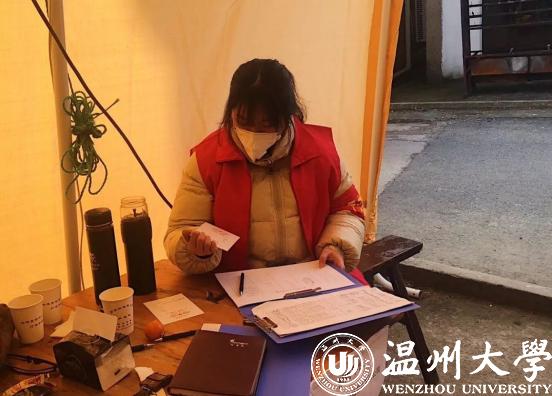 2月20日,作为杏吧 星之火志愿者协会的一员,这是钱依范参加协会组织的青年防疫突击队的第18天,自2月2日起,他就在瓯海茶山“先锋岗”值班。禁止外地人进村、给往来的村人测量体温并记录是他志愿者工作的日常。值班的时间段安排是凌晨四点到八点,晚上八点到十二点。每天在平均温度3、4摄氏度的室外伫立,经常脚会被冻麻。为了御寒,他值班时常常不停的跺脚,尤其是晚上夜班,更是寒风刺骨。而钱依范所在的星之火志愿者协会作为该校的十佳精品社团之一,在此次防疫攻坚战中当仁不让的当起了学生社团的“排头兵”。