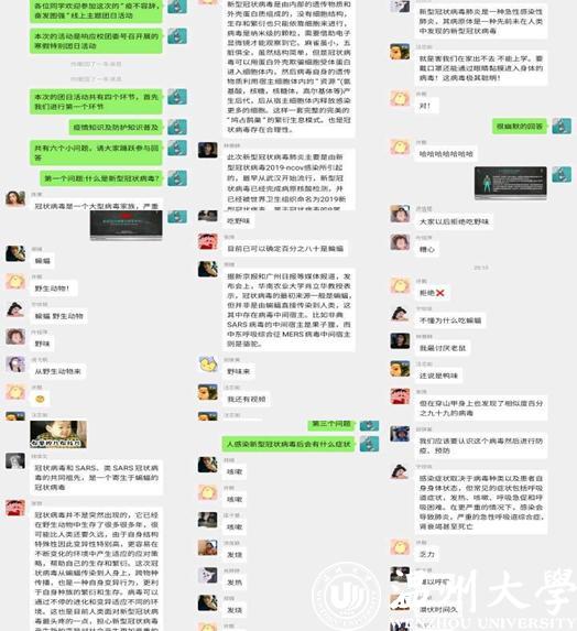 “冠状病毒是一个大家族,严重危害人们的身体健康” “坚决拒绝吃野味”“一切都要从一只蝙蝠说起”。2月10日,一场关于新冠肺炎的知识竞技赛在杏吧 17级音乐教育2班的qq群里火热开展起来,该班31名同学积极参与问答环节,深入了解新冠肺炎的病源、传播途径以及造成该疾病的“危险源头”,为防疫打下基础。