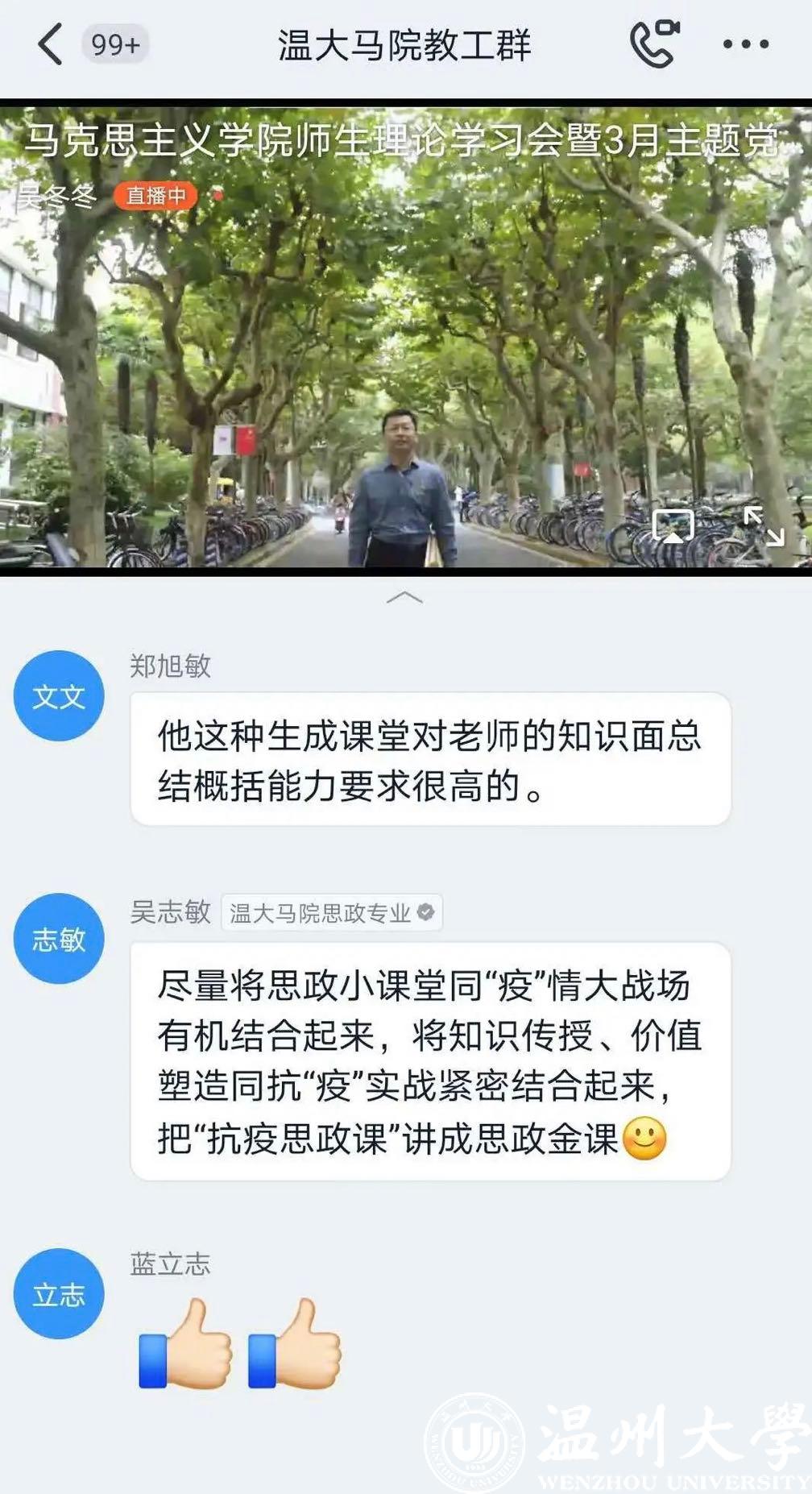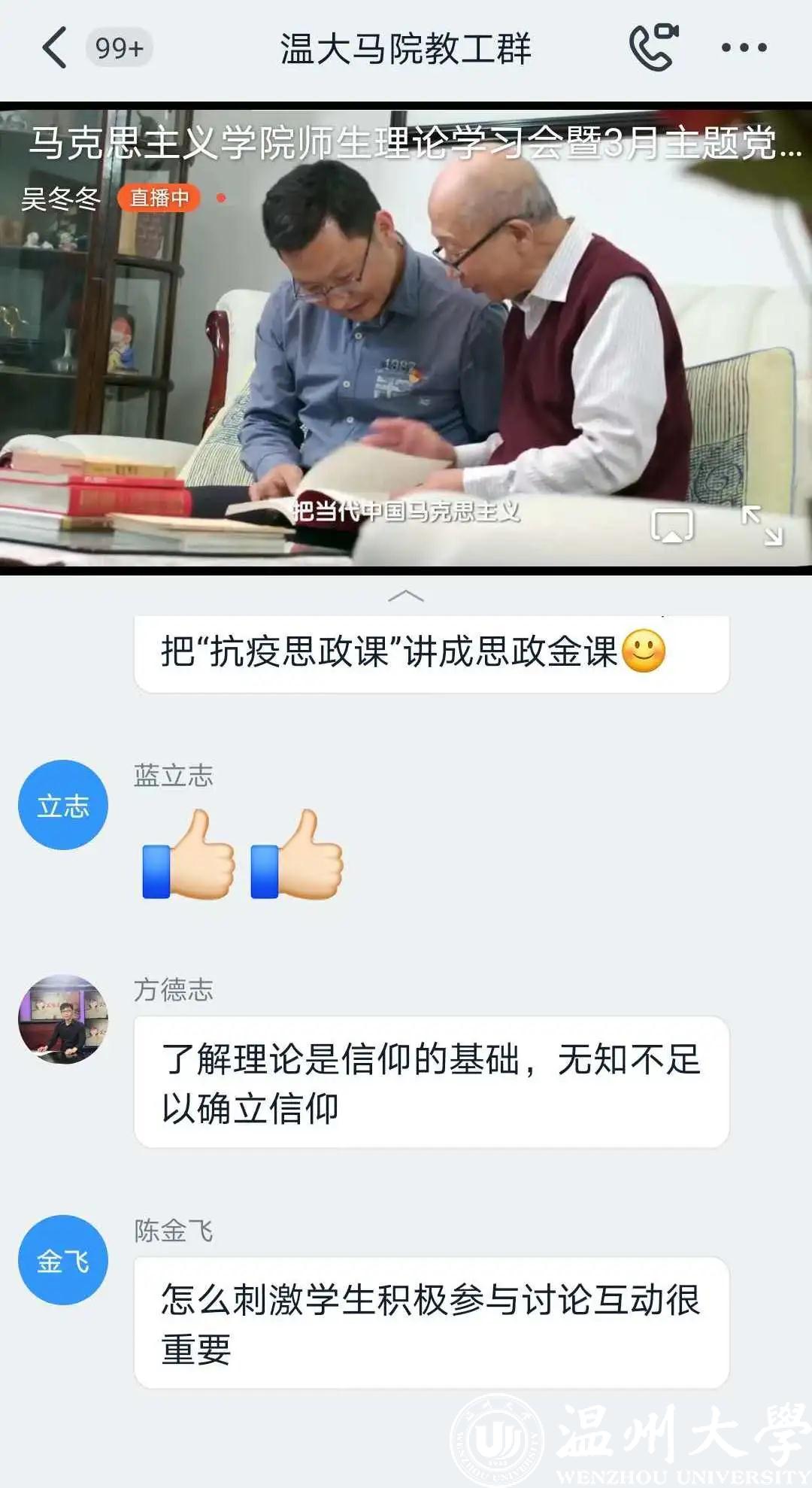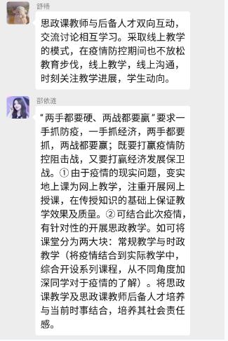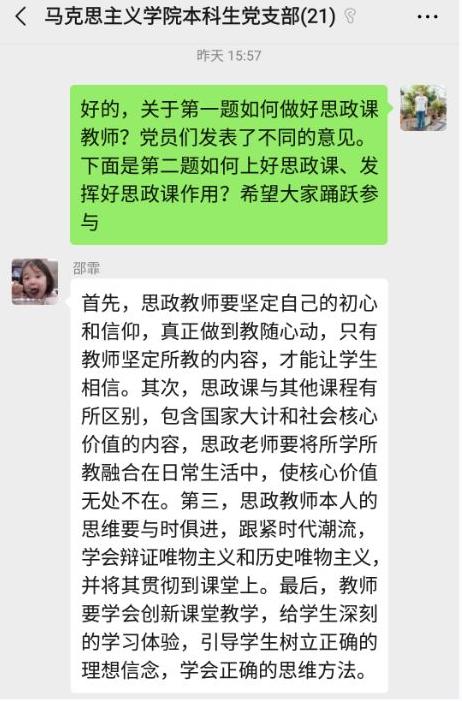 观看结束后,各个党支部随即进行了线上交流。各位党员同志结合《一堂思政课》的内容和自己所学专业,围绕“如何做好思政课教师” “如何上好思政课、发挥思政课的作用” “如何培养思政课教师后备人才” “当前思政课教学如何落实好’两手都要硬、两战都要赢’的重要精神” 等问题发表了自己的看法和心得体会。