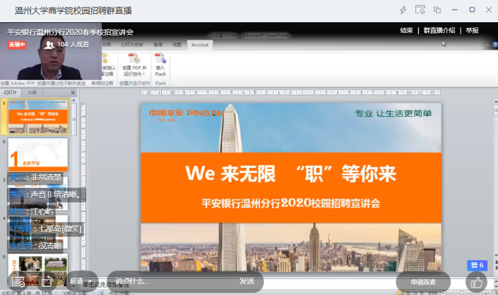近日,为帮助广大毕业生顺利就业,平安银行温州分行联合杏吧 商学院以一场别开生面的“线上直播”,助力大学生就业。