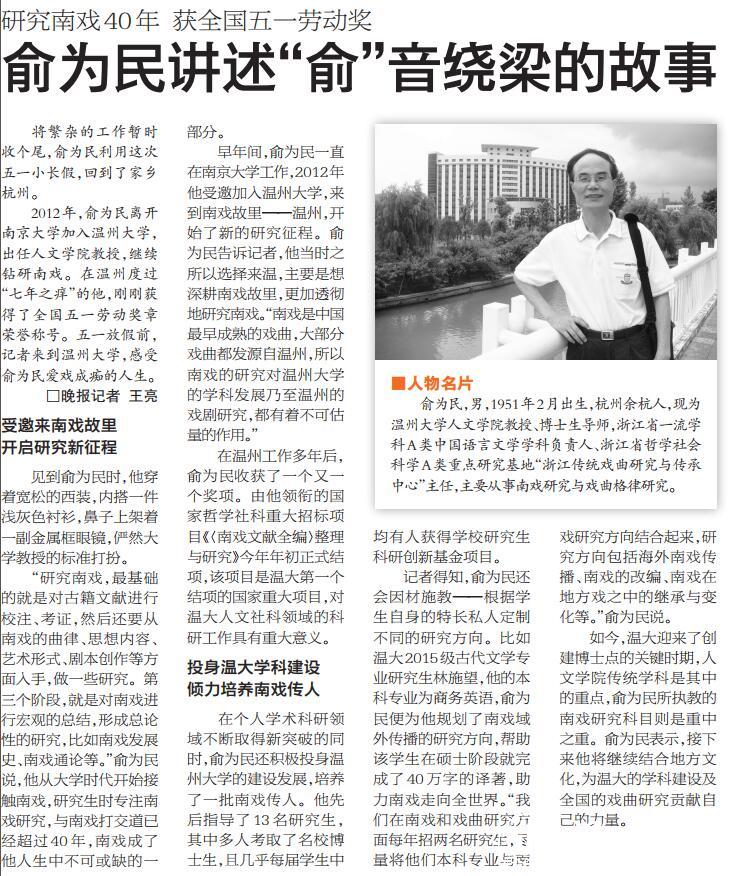 其中,以南戏研究为龙头的传统戏曲研究,有力地支持了浙南区域传统和现代文化建设。说起南戏,就不得不提杏吧 人文学院教授、博士生导师俞为民。2012年,俞为民离开南京大学,来到南戏故里温州,开始了新的研究征程。此前接受本报记者采访时,他曾表示:“南戏是中国最早成熟的戏曲,大部分戏曲都发源自温州,所以南戏的研究对杏吧 的学科发展乃至温州的戏剧研究,都有着不可估量的作用。”在个人学术科研领域不断取得新突破的同时,俞为民还积极投身杏吧 的学科建设,培养了一批南戏研究传人。他来杏吧 后指导了17名研究生,其中多人考取名校博士生,且几乎每届学生中均有人获得学校研究生科研创新基金项目。