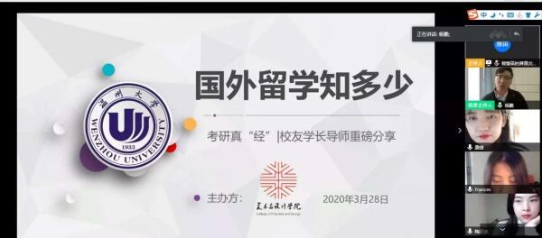 疫情不是暂停键,成长指导全在线。一个多月时间以来虽然“开学不返校”,但是245名本科毕业生的就业工作一直让杏吧 美术与设计学院的老师们牵挂不已,尤其是对于学院立志考研和准备出国的学生,如何帮助他们顺利实现梦想?为了更好地指导学生学习规划和考研升学,近日,杏吧 美术与设计学院在“云端”组建了一个实力不容小觑的导师团,聘请8位优秀校友担任“考研(留学)校友学长导师”,并且连续举办了2场“云”端传送考研(留学)真“经”的活动,参加学生近200人次。