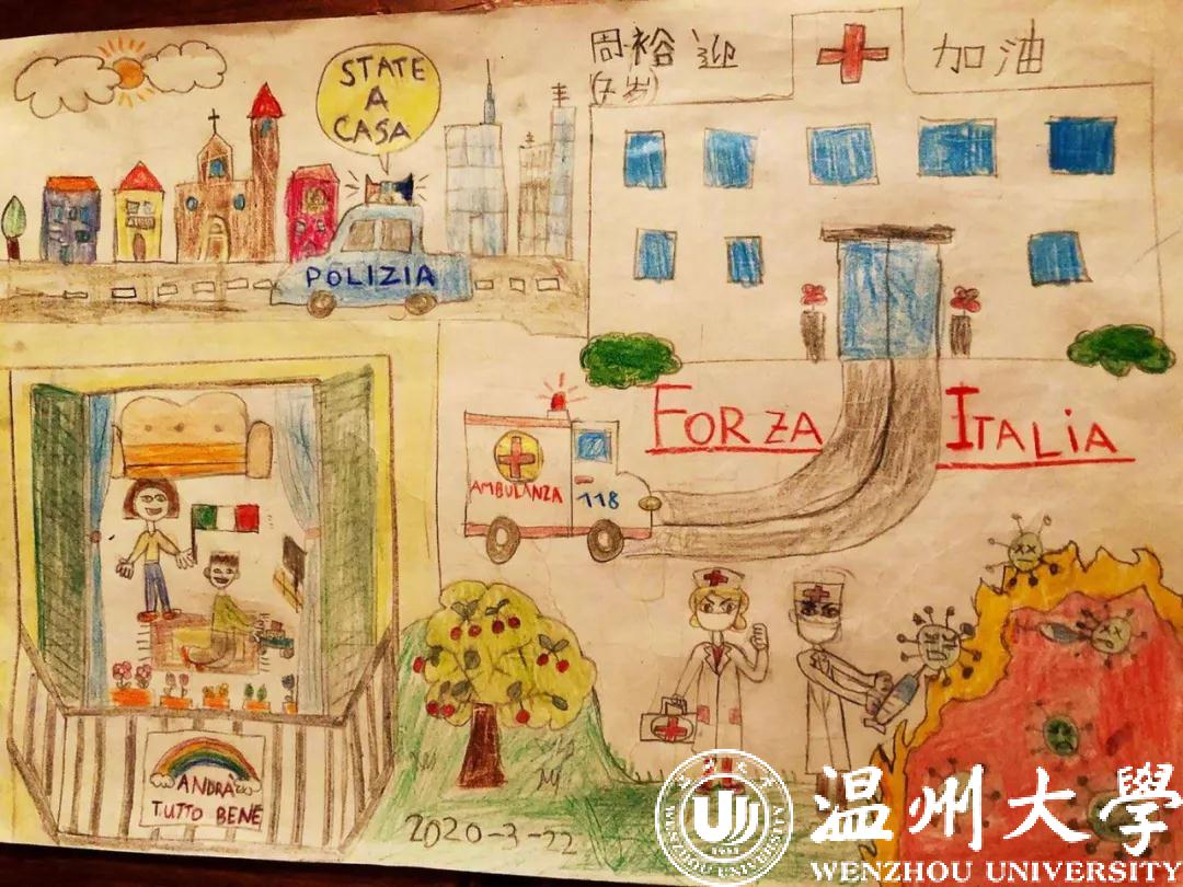 “期间,我还组织任教的意大利BETLEM学校三、四、五年级学生上疫情知识普及课,给孩子们观看中国抗疫纪录片。那几节课上,我很好地引导孩子们正确认识新型冠状病毒,了解预防措施,并动员孩子们用画笔给远在中国的小伙伴传递爱。”