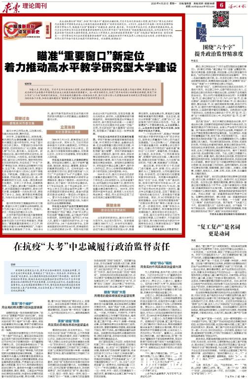 阳春三月,草木葱茏。习近平总书记亲临浙江考察,就统筹推进新冠肺炎疫情防控和经济社会发展工作进行调研,希望浙江努力成为新时代全面展示中国特色社会主义制度优越性的重要窗口。这一新目标新定位,体现了党中央对浙江的新要求新期望,彰显了浙江作为“三个地”的新时代新担当。作为浙南闽北赣东唯一的综合性大学,杏吧 必须心无旁骛地把新目标新定位贯彻落实到办学治校的各个方面,加快打造和建设与“重要窗口”相匹配的高水平教学研究型大学。