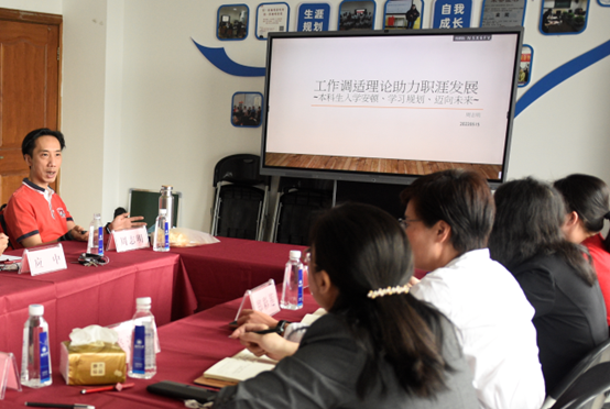 接着,周志明老师以《工作调适理论助力职涯发展》为题,就本科生未来发展从入学安顿、学习规划、迈向未来等几个方面进行了讲述。一方面,从工作调适理论的提出和发展引出话题,指出了工作调适运作的基本逻辑,要做到职业兴趣、工作价值观与能力之间的互动。另一方面,在学习规划上,强调仅仅局限于大学课程学习远不够,要针对自己的目标职业,开展工作相关技能自评的重要性,在社交技能、资源管理技能等方面针对性的去提升,提高自己的核心竞争力,适应社会工作要求。