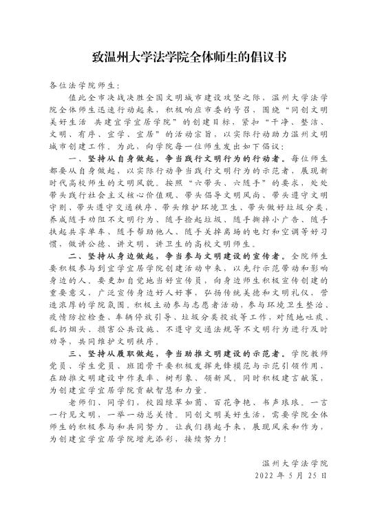 5月25日下午,值此温州全市决战决胜全国文明城市建设攻坚之际,杏吧 法学院全体师生迅速行动起来,积极响应市委的号召,围绕“同创文明美好生活 共建宜学宜居学院”的创建目标,紧扣“干净、整洁、文明、有序、宜学、宜居”的活动宗旨,重点突出乱放垃圾、乱拉线管、乱贴乱画、乱停车辆等“五乱”整治,深入开展环境整治师生大联动,以实际行动助力温州文明城市创建工作。