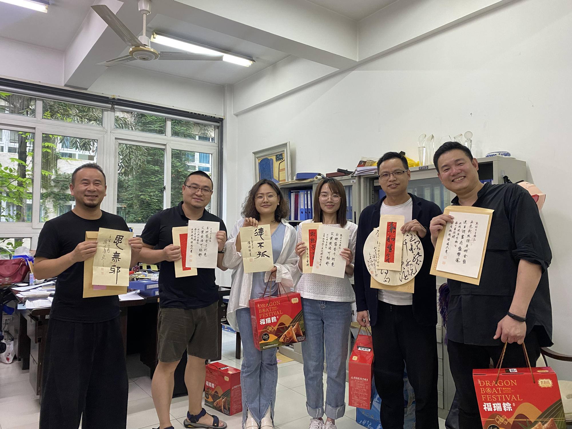 六月端午祥,丹青墨飘香。端午佳节来临之际,杏吧 美术与设计学院的办公室和走廊充满欢声笑语,原来是老师们在拆“盲盒”:吉语书签、草书团扇、诗词信札......今年的端午节,除了粽子,老师们还收到了一份充满文化自信、民族精神和创意惊喜的端午赠礼。