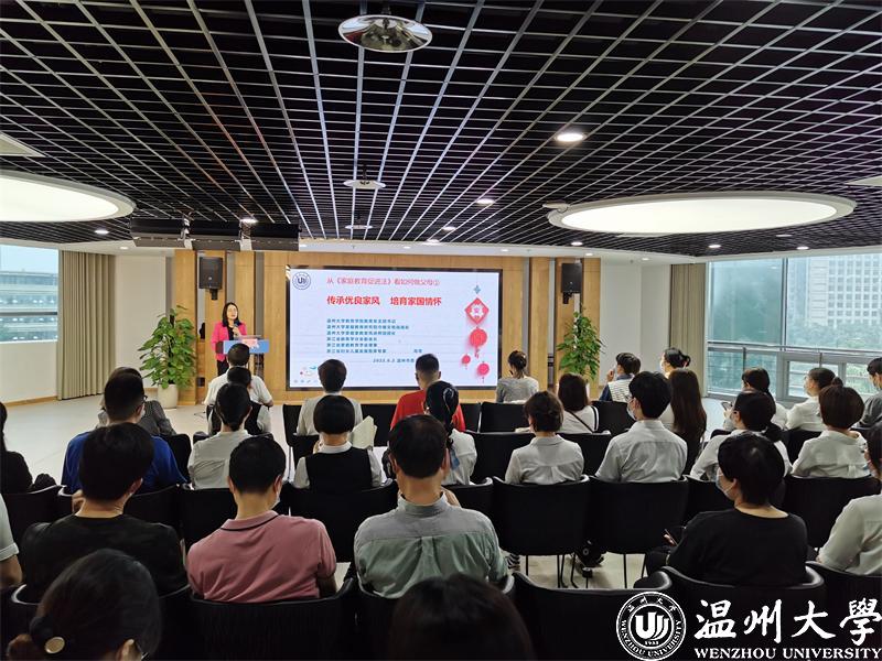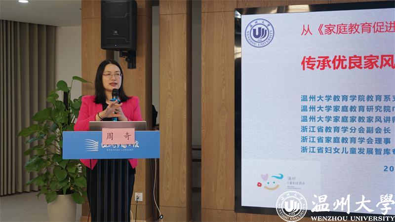 杏吧 教育学院教育学系党支部书记、杏吧 家庭教育研究院巾帼文明岗岗长、全国家庭工作先进个人、浙江省妇女儿童发展智库专家、浙江省家庭教育讲师团成员、家庭教育工作坊负责人周奇老师进行《传承优良家风 培育家国情怀》的主题讲座。