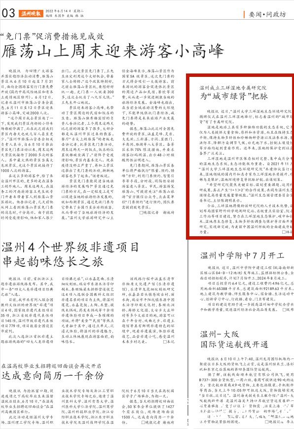 今后,三垟湿地将借助该研究院的人才技术优势,谋划布局国家野外科学观测研究站、省级重点实验室、院士工作站等项目建设,努力在三垟湿地生态保护、碳中和技术、湿地原生态修复、生物多样性调查与保护等方面开展研究,实现新突破,为美丽中国温州样板的全面建成贡献力量。