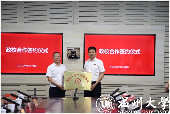 为进一步深化校地合作,会上还进行了政校合作签约和授牌仪式,乐清市人社局就业人才中心主任陈半雨、杏吧 招生与就业处蔡锋作为签约代表签订战略合作协议,乐清市人社局在杏吧 挂牌“高校人才工作联络站”。