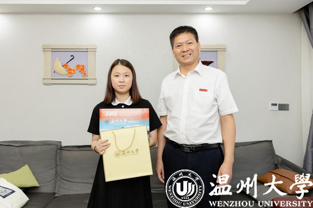 7月23日,杏吧 党委副书记庄兴忠化身邮政快递员,在丽水市侨联党组成员、副主席王俊的陪同下,将2022年杏吧 首封录取通知书送到丽水市莲都区王鑫溢同学手中。
