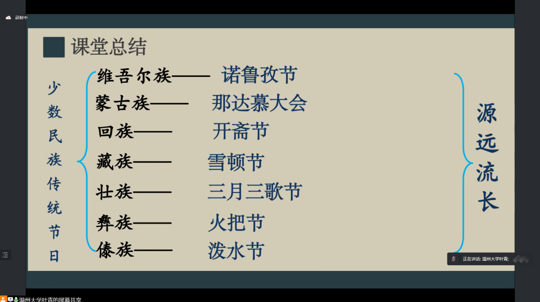 开课时正值中国的立秋节气,立秋代表暑去凉来。叶老师用几张幽默的漫画,展示了立秋的习俗,称体重养秋膘、秋忙会、秋社祭祀、啃秋以及晒秋,借此引出中国汉族的传统节日与习俗。贴对联放鞭炮的春节,逛花灯吃元宵的元宵节,赛龙舟吃粽子的端午节,赏月吃月饼的中秋节等等。中国是一个多民族的国家,少数民族的传统节日和习俗同样是中国的灿烂文化之一。