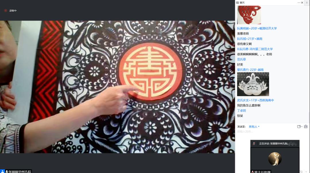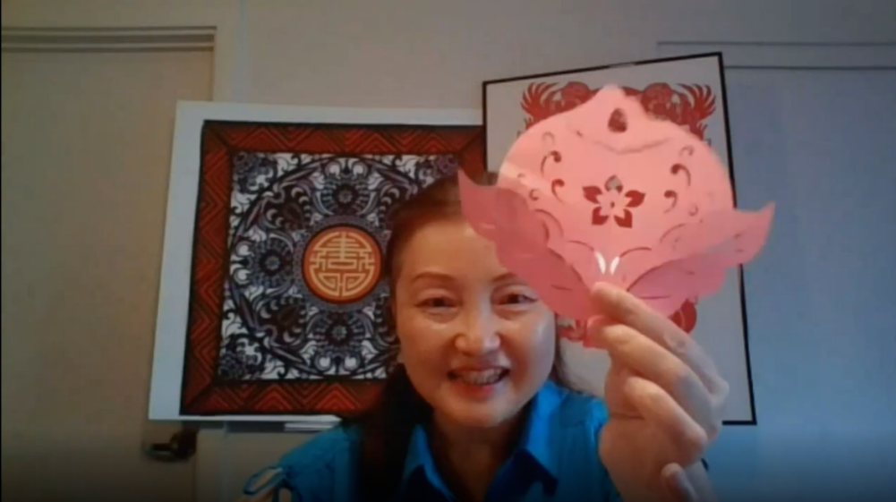 课程中,浙江省民间文艺家、温州非遗剪纸项目代表性传承人张丽丽老师为海外华裔青少年们带来了非物质文化遗产——剪纸体验。剪纸是中国最古老的民间艺术之一,实物剪纸技艺距今已有1500余年的历史,是用剪刀或刻刀在平面纸上创作锯齿纹、波浪纹、水滴纹、月牙纹等不同纹,属于镂空艺术。