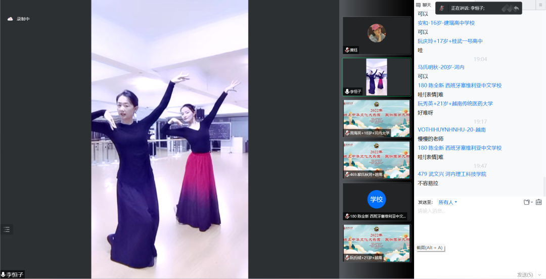 李恒子老师以维吾尔族舞蹈与朝鲜舞为主要教学内容,在专业舞蹈教室架起直播设备,与助教一起为海外华裔青少年们亲身示范舞蹈动作,营造了一个“云端舞蹈课堂”,让学员们宛如亲临舞蹈教室现场,同步学习优美的中国民族舞蹈动作。李恒子老师凭借丰富的教学经验与技巧一步步耐心地引导学员们学习维吾尔族舞蹈与朝鲜族舞蹈的基本动作、熟悉音乐的节奏与韵律、感受中国少数民族传统文化的独特魅力。李恒子老师亲切耐心的教学风格充分调动了学员们参与课堂互动的热情,他们纷纷打开摄像头,精心调整好距离,争相向李老师展示自己的舞蹈练习成果,在云端体验到了沉浸式教学的氛围与乐趣。