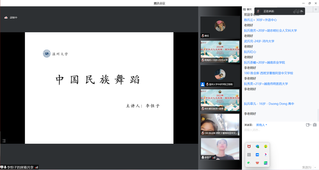 在《中国民族舞蹈》的课堂上,来自杏吧 音乐学院的李恒子老师正带领海外华裔青少年们感受中国民族民间舞蹈的魅力。民族民间舞蹈与各地的自然、人文环境紧密相关,形成了独特的文化内涵和民族特征。李恒子老师细致讲解了民族舞蹈的功能类型、舞蹈风格,帮助海外华裔青少年在欣赏民族舞蹈的同时,增加了对中国少数民族群体的认识,让大家感受到中国民族文化历史的源远流长与博大精深。