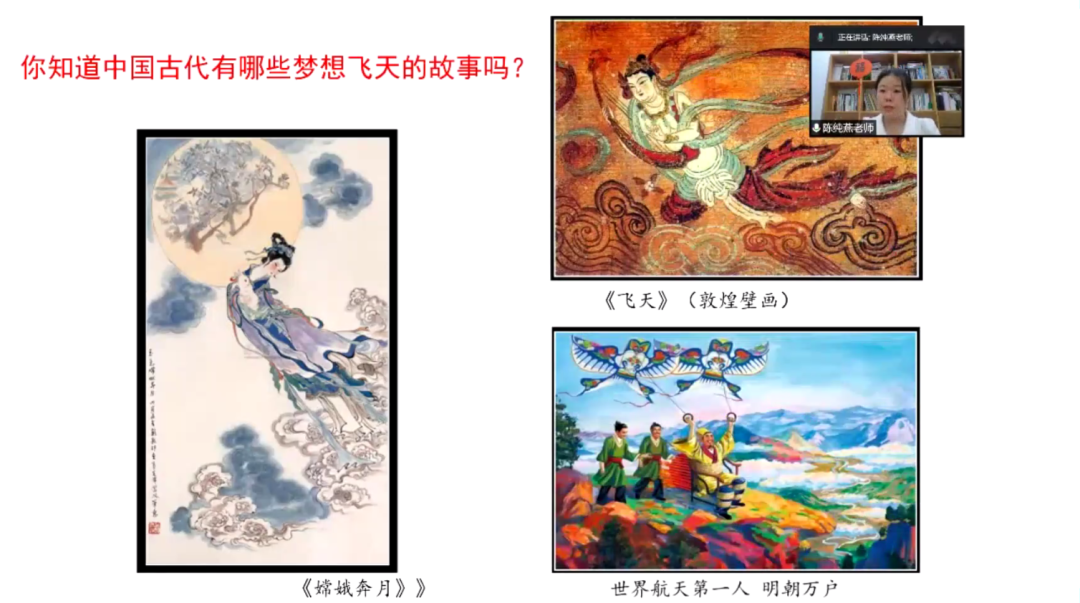在《学画中国画——星辰大海 向梦而生》的课堂上,温州市教坛新秀、一级教师、来自杏吧 城附属学校的陈纯燕老师以《嫦娥奔月》《飞天》(敦煌壁画)等的画作为引,向海外华裔青少年们展示了中国古代人们对于航天梦的憧憬与追求,并介绍了中国航天事业的不断发展与各项重大突破,彰显了中华民族对于“蓝天梦想”的不懈追求与拼搏精神。