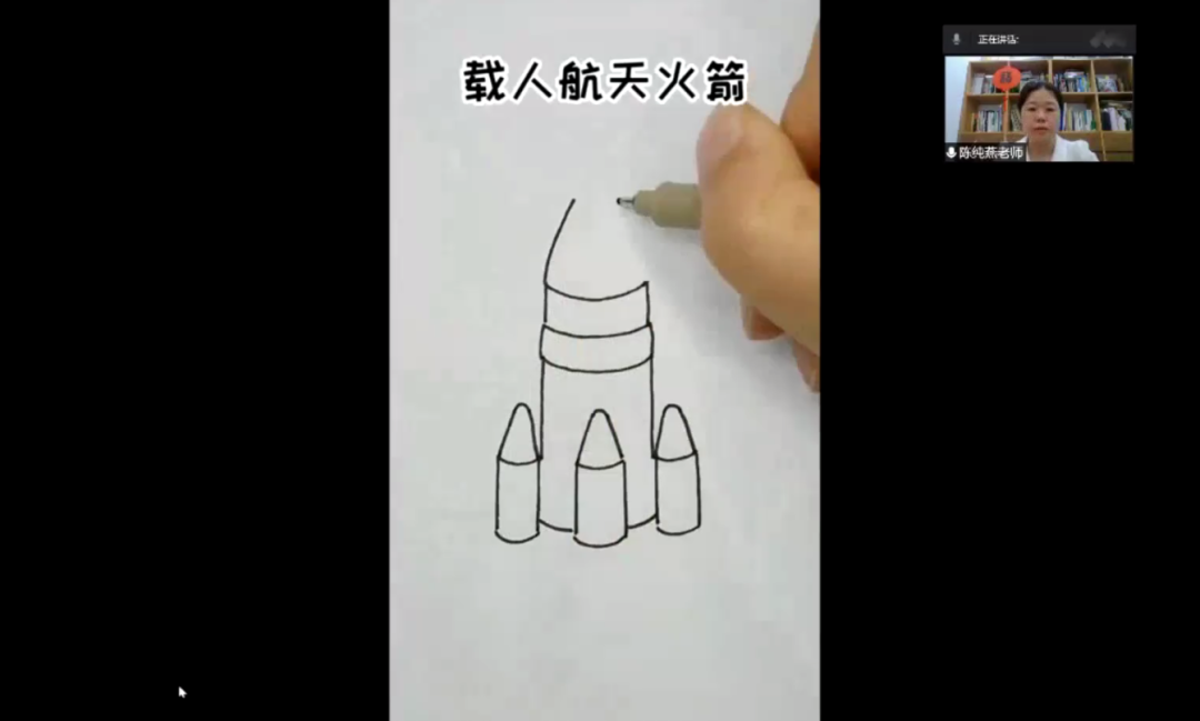 陈纯燕老师一笔一划地示范“载人航天火箭”的绘画步骤、讲解用描“动态线”的方法进行航天服的绘制,并引导学员充分发挥想象力,用手中的画笔绘制出自己心目中的载人火箭以及宇航员的模样。课后,学员们积极地在云端课堂上展示、分享自己的作品。陈纯燕老师一一作了指导与点评,让华裔青少年们受益匪浅。