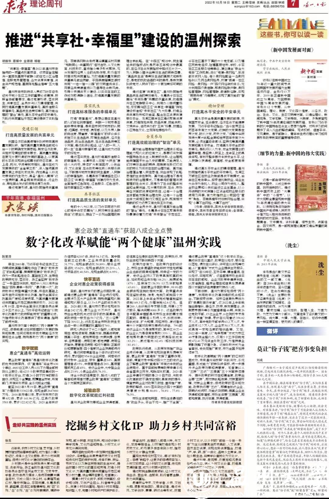 通过党建引领,温州协同推进共富单元。苍南县网联会走进藻溪镇富溪村开展“知联同心·共富同行”结对活动,从文化教育、科技助农,宣传推介等多形式帮扶,充分发挥网络界人士的优势作用,助力结对村居实现共同富裕,为打造高质量发展的共富单元做出贡献。平阳县南雁镇笠湖村利用“一站一馆一公园”的文明宣传体系,开展各类美德宣传以及倡导社会新风尚,引导乡贤捐资家乡建设,以实实在在的工作成效取得群众信任,打造高质量发展的共富单元。