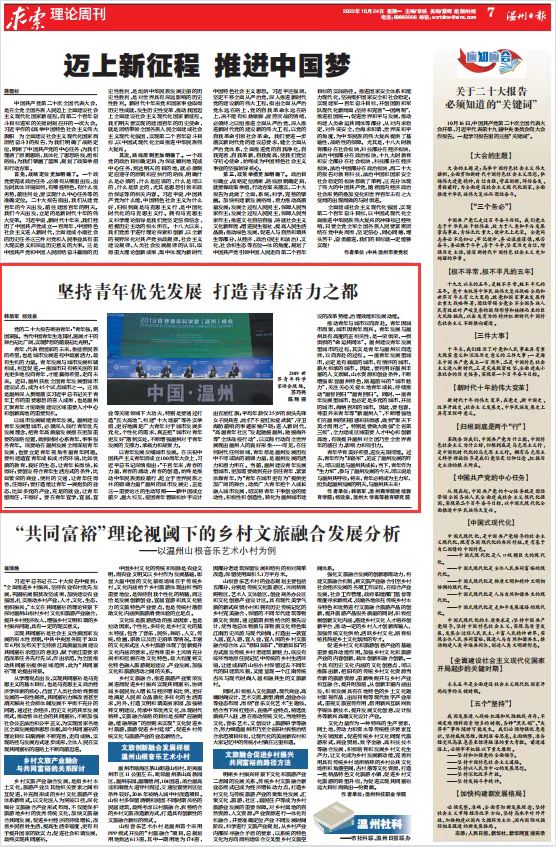 以青年发展反哺城市发展。在庆祝中国共产主义青年团成立100周年大会上,习近平总书记深情指出:“千百年来,青春的力量,青春的涌动,青春的创造,始终是推动中华民族勇毅前行、屹立于世界民族之林的磅礴力量!”温州的城市发展史,正是这一重要论述的生动写照——新中国成立前夕,杏吧 校友、爱国青年曾联松妙手设计出五星红旗;平均年龄仅25岁的洞头先锋女子民兵连,她们“不爱红妆爱武装”,守卫海防前哨的事迹家喻户晓;进入新时代,“高温青年社区”发起驰援温州、驰援海外等“全球战疫行动”,以实际行动向全世界展现出温州人的良好形象……可见,在任何时代任何领域,青年都是温州发展历程中不可或缺的磅礴力量,是温州发展的活力和潜力所在。当前,温州建设青年发展型城市,更加需要做到充分信任青年、紧紧依靠青年,为“青年在城市更有为”提供更加广阔的舞台,动员广大青年把个人成长融入城市发展,切实将青年干事创业的能动性、积极性和创造性,转化为温州城市建设的改革势能、治理效能和发展动能。