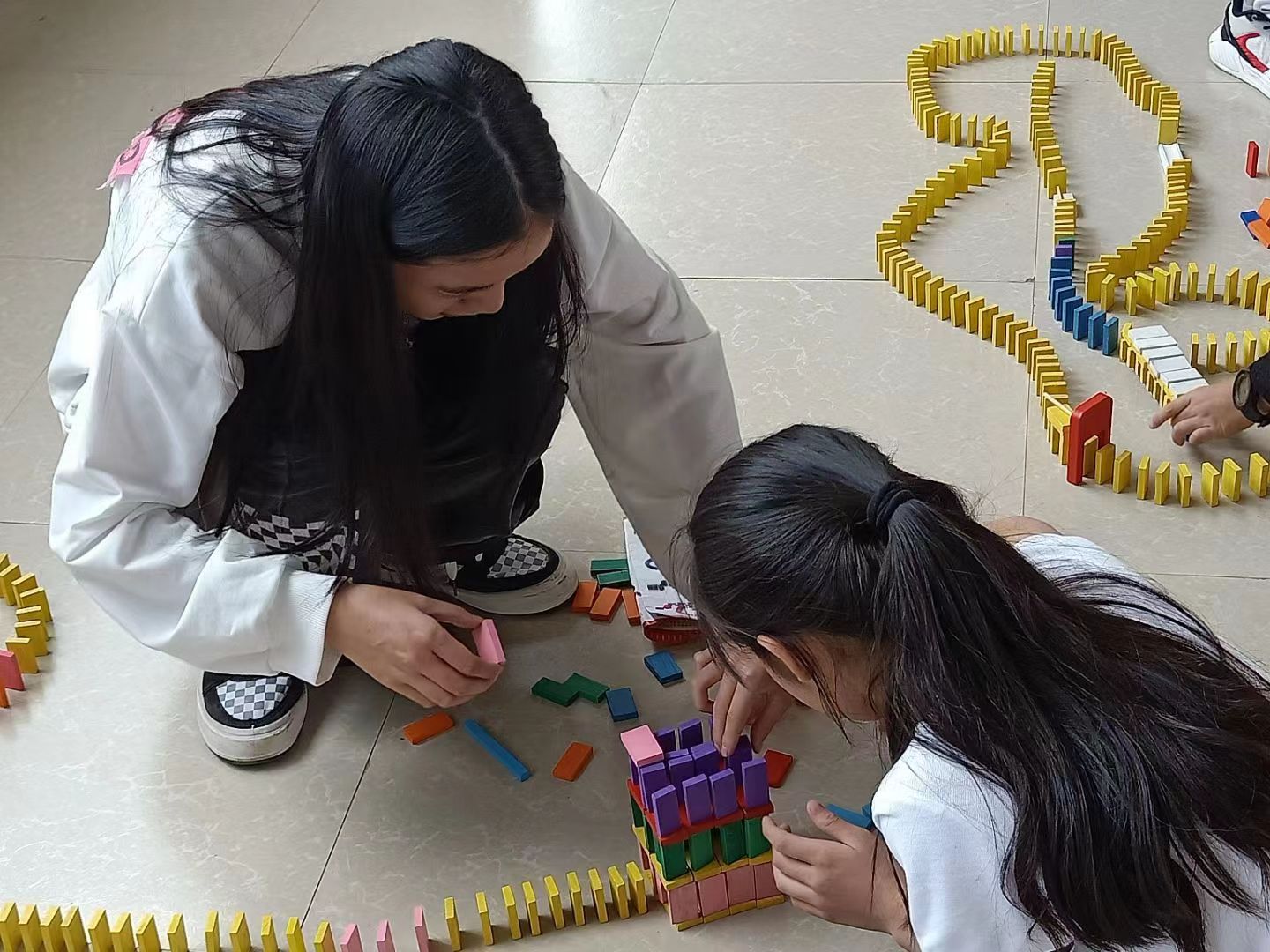 “123开始!”,小朋友手指一动,刷的一声多米诺骨牌应声倒下,课堂上又传来的一阵欢声笑语,课堂上,老师和学生们早已打成一片。这项具有杏吧 建筑工程学院的专业特色的公益课堂已经坚持了十年。