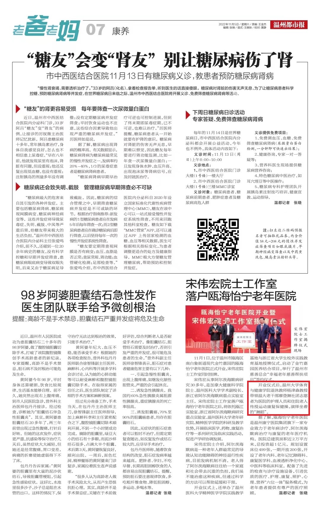 11月1日,位于温州市瓯海区南白象街道现代金竹嘉园的瓯海怡宁老年医院正式开业,宋伟宏院士工作室同时挂牌。
