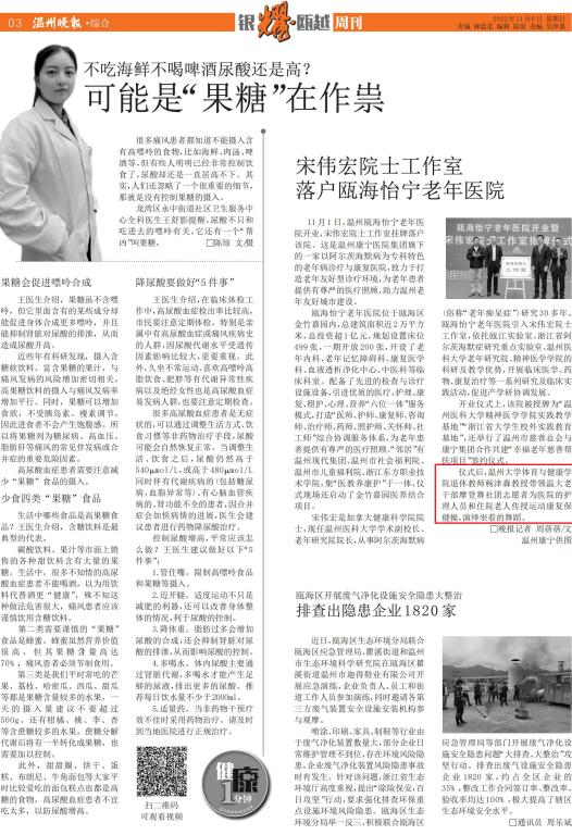 11月1日,温州瓯海怡宁老年医院开业,宋伟宏院士工作室挂牌落户该院。这是温州康宁医院集团旗下的一家以阿尔茨海默病为专科特色的老年病诊疗与康复医院,致力于打造老年友好型诊疗环境,为老年患者提供有尊严的医疗照顾,助力温州老年友好城市建设。