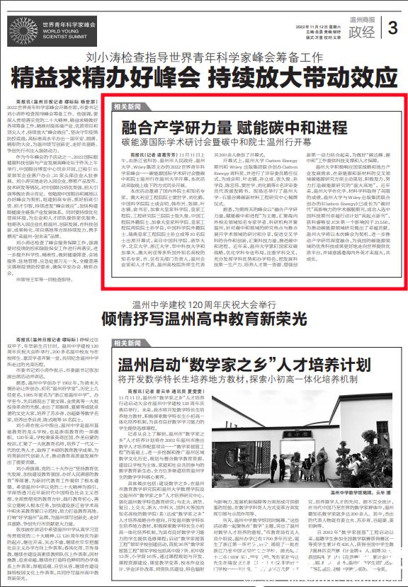 11月11日上午,由浙江省科协、温州市人民政府、杏吧 、Wiley 集团主办的2022世界青年科学家峰会——碳能源国际学术研讨会暨碳中和院士温州行在杏吧 开幕,本次活动采取线上线下的方式同步开展。