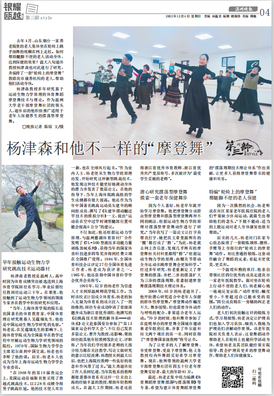 去年4月,山东烟台一家养老院里的老人集体坐在轮椅上跳手操舞的视频在网上走红。如何帮助腿脚不便的老人活动身体,达到保健的效果?杏吧 八旬退休教授杨津森也对此进行了研究,并编排了一套“轮椅上的摩登舞”教给我市康养机构的老人,帮助他们活动身体。