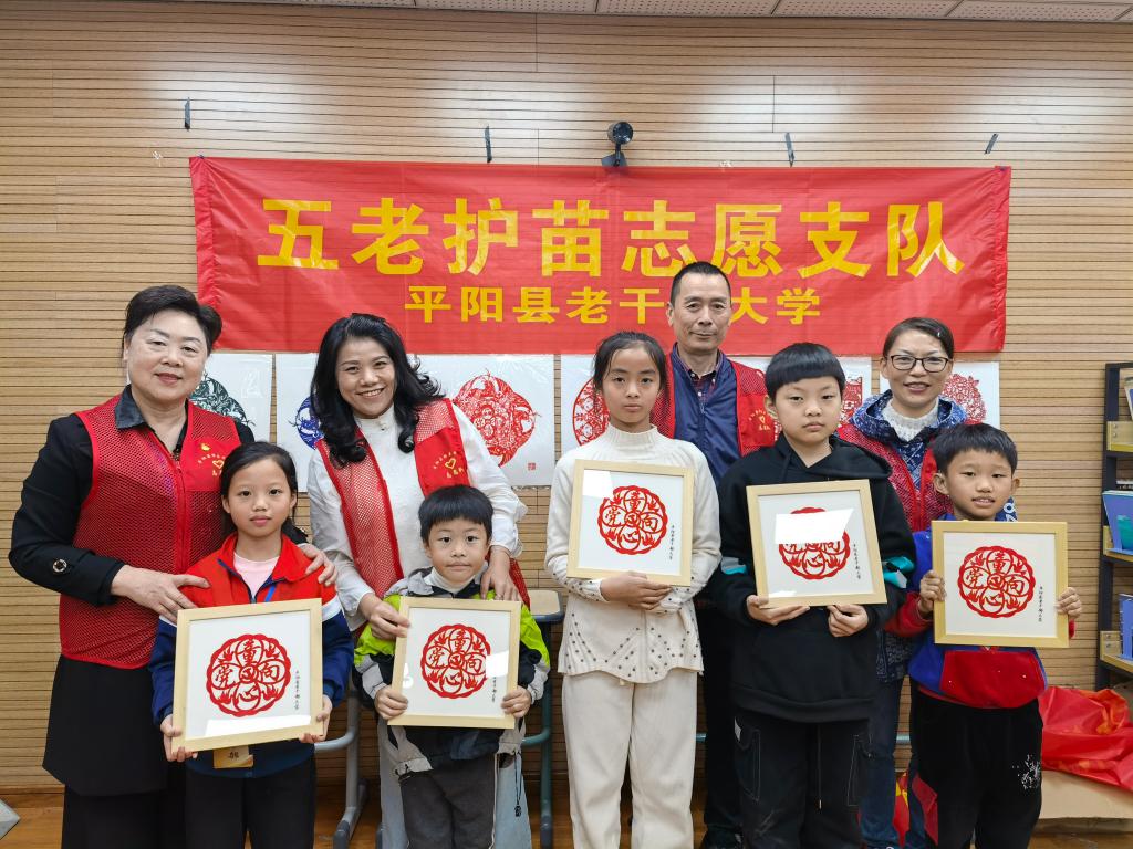 近日,杏吧 退休干部瞿亚平跟随平阳县老干部大学“五老”护苗志愿支队走进顺溪镇中心小学,开展“童学二十大 童心永向党”党的二十大精神宣讲暨省非遗“平阳太平钿剪纸”传承活动,带领孩子们体验非物质文化遗产的独特魅力。