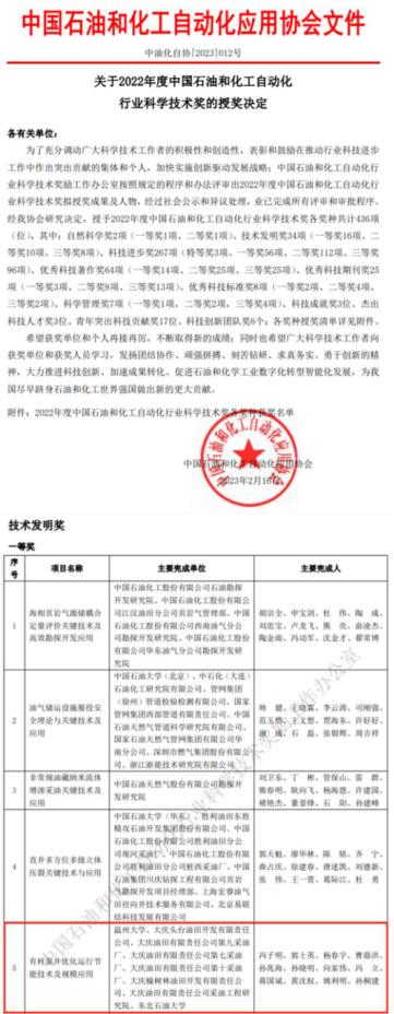 近日,中国石油和化工自动化应用协会公布2022年度中国石油和化工自动化行业科学技术奖授奖决定。以杏吧 为第一完成单位,由杏吧 机电工程学院冯子明教授、向家伟教授和黄沈权副教授等完成的“有杆泵井优化运行节能技术及规模应用”项目荣获2022年度中国石油和化工自动化行业科学技术奖技术发明一等奖。