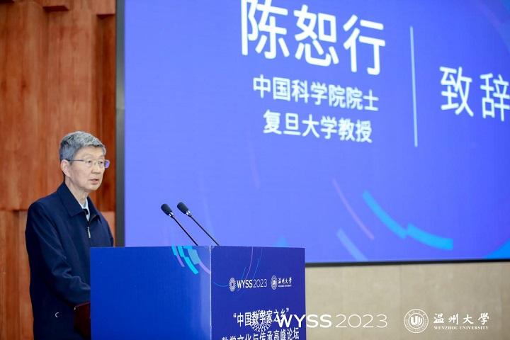 陈应许致辞。他代表温州市政府向院士、专家、来宾表示热烈欢迎,向长期以来关心和支持温州改革发展的各位领导、社会各界人士表示衷心感谢。他指出,温州素有“东南小邹鲁”之称,也是中国数学家的摇篮,被誉为“数学家之乡”。新时代,温州擦亮“数学家之乡”金字招牌是绵绵用力,久久为功,例如,打造了世界青年科学家峰会、中国数学教育研讨会、温籍数学家研究中心、温籍数学家长廊等多种平台,出台了《温州数学家家园建设方案》,充分发挥温籍数学家资源丰富的独特优势,加速引育一批国内外数学家等等。他在致辞中提出三点建议意见:一是汇聚最强大脑,助力温州加强数学基础研究;二是汇聚最强资源,助力温州加强数学人才的培养;三是汇聚最优人才,助力温州建设人才创新高地,希望得到院士、专家的帮助和支持,共同擦亮温州“数学家之乡”城市金名片。