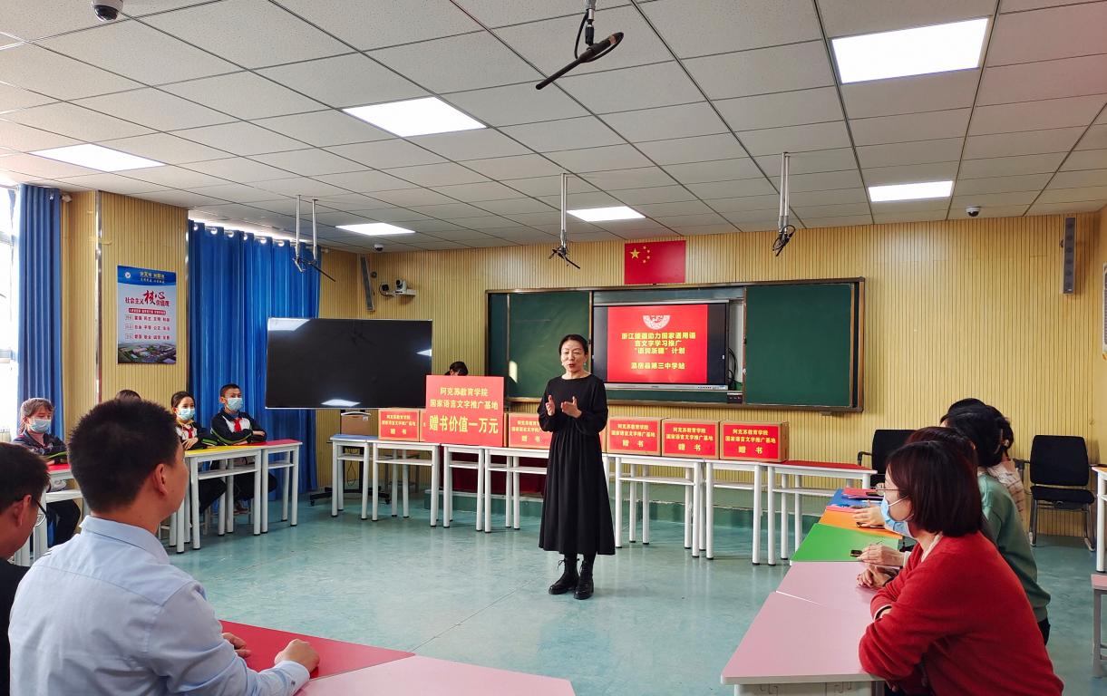 “垚垚俊峭天山,迢迢灵秀瓯江。凝心聚力倾情,推进语润浙疆。”近日,杏吧 教育学院援疆教师胡雯圆满结束了从浙到疆的“语润”之旅,满载而归。在学院举行的师德师风专题教育活动上,胡雯老师将她的“西行”故事娓娓道来。此番援疆,她“授人以渔”、育苗培才,也让国家通用语言文字走进城镇乡村,民族团结之花处处盛开。
