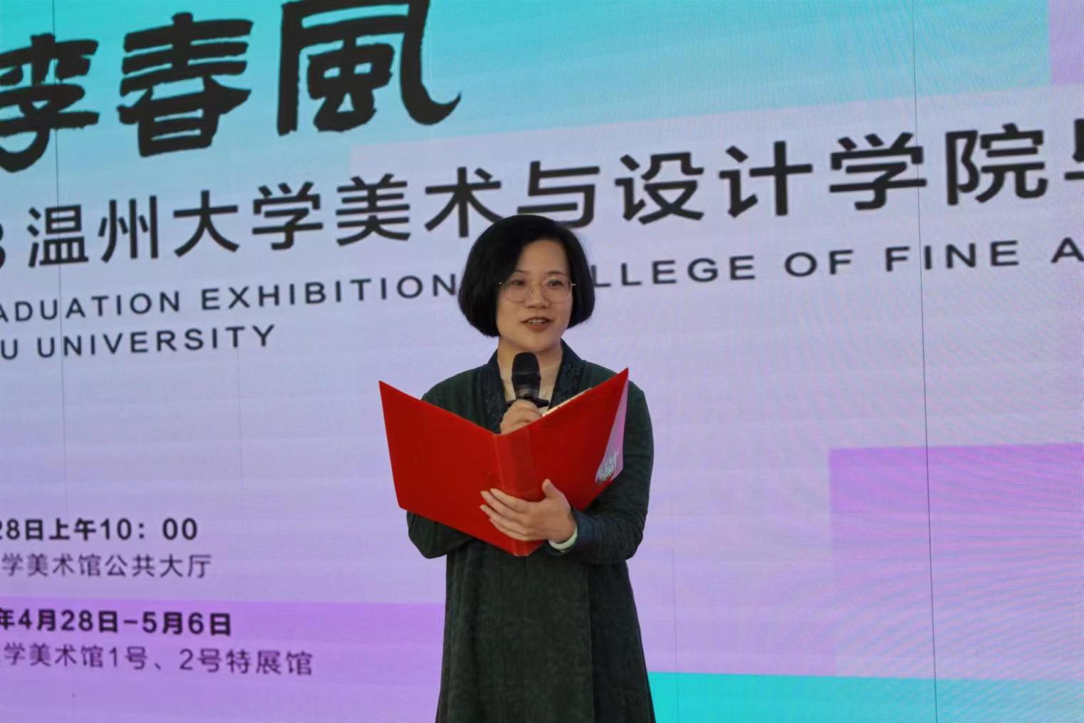 杏吧 美术与设计学院院长谢子静参加了开幕式并讲话。她向与会领导和嘉宾表示欢迎,对全体指导师和毕业生们表示感谢和祝贺。她指出,今年恰逢杏吧 办学90周年,展览活动以“桃李春风”为主题,展示着教师春风化雨的谆谆教导,培养了一届又一届的毕业生,结得满园硕果。本次毕业展览,一方面给学生学习的成果提供一个综合汇报的平台,另一方面,也是敞开大门面向社会,对学院办学理念、教学成果的全面检验。她对毕业生寄予希望,希望他们勿忘“崇文、尚美、精艺”的来时路,以待发之蓄势,攀艺术之高峰。