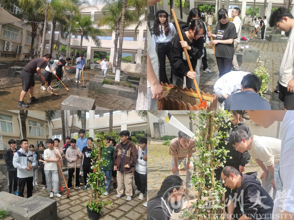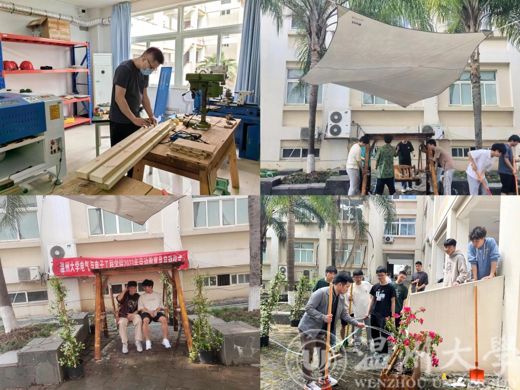 为了这次特别的劳动任务,电气电子学院的师生已经忙活了两三天了,购买绿植、木材、五金、清洁工具、天幕,材料准备就绪后,4月26日下午师生一起拿起扫帚、撸起袖子,除杂草、扫落叶,合力冲洗地面,一起清理杂物,经过一番热火朝天的忙活后,中庭部分终于有了让人期待的面貌。随后,学院邀请两位劳动实践指导老师,来自学校资产经营公司绿化公司的游海经理以及物业公司主管、花艺培训师陈建茜老师一起指导同学们开始种植花木。同学们认真的听讲,记录要点,在老师们的指导下,很快将热情奔放的三角梅、高洁芬芳的风车茉莉种于院内,铲土、植树、提根、浇水,同学们个个忙得不亦乐乎。活动的高潮在同学们和廖晓安老师把一架亲手打造的秋千搬进院子,合力撑起天幕时到来,同学们想象着日落时分,闲步中庭,荡秋千、赏春花、谈人生……同学们纷纷称赞这将是学院微型的“5A级景区”。
