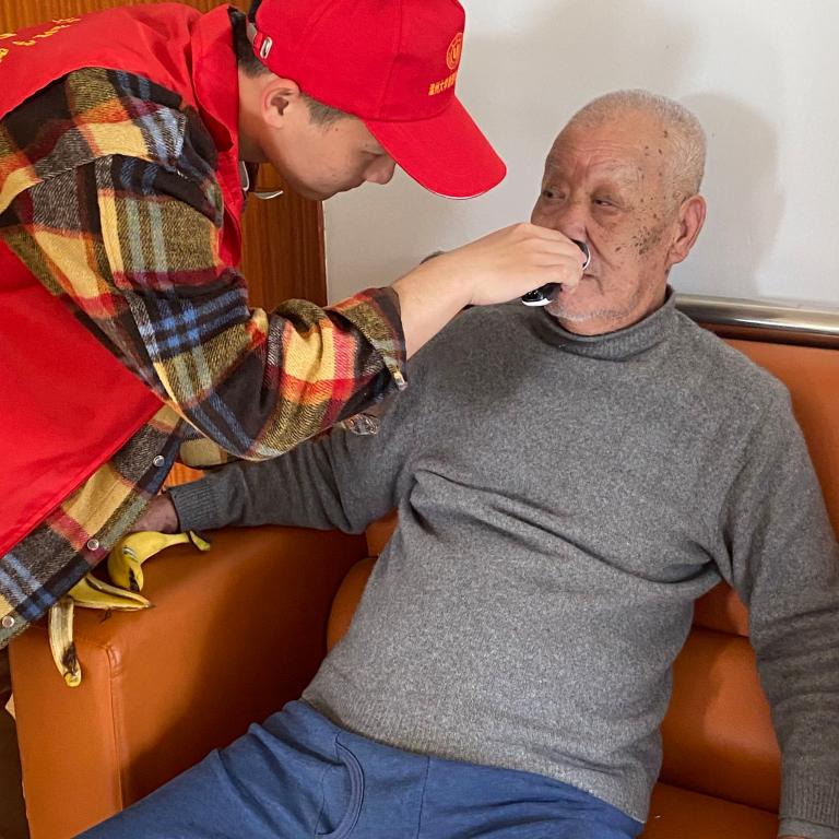 “阳光”青年志愿者为老人剃胡子。