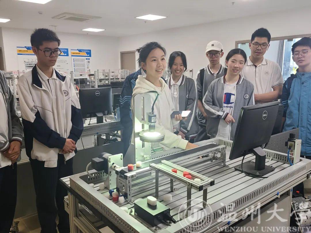 在老师的讲解和示范下,同学们亲身体验着各种各样的科技项目,包括智能小车控制、 VR、智能制造学习工场、工业机器人视觉实践、工业机器人与数控机床实践等内容,带领青少年用视觉和触觉零距离感受Al科技带来的魅力。“活动很有意义,我不仅体验到科技的奥秘,更是难得的一次动手动脑实践锻炼的机会,很多都是课本中没有的知识”来自温州第二高级中学初二的陈同学分享到。