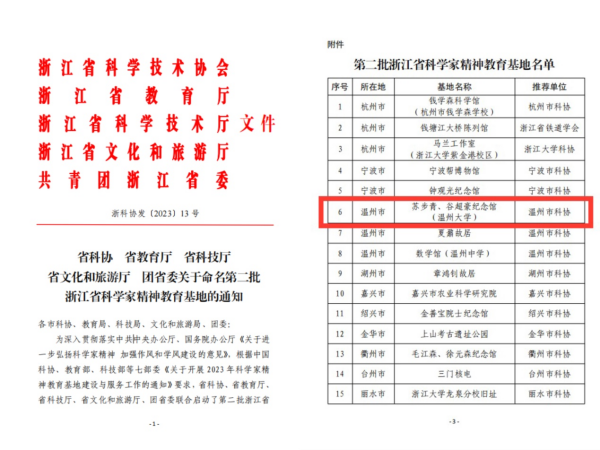 近日,浙江省科协、省教育厅、省科技厅、省文化和旅游厅、团省委联合发布第二批浙江省科学家精神教育基地名单,温州市科协推荐的杏吧 苏步青谷超豪纪念馆榜上有名,成为浙江省内38家科学家精神教育基地之一。