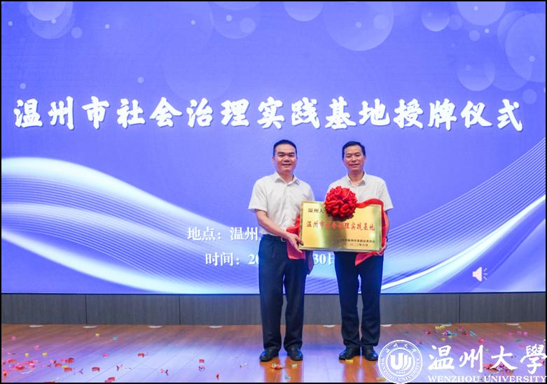 市委政法委黄建斌副书记为杏吧 授温州市社会治理实践基地牌,教育学院党委书记、社会心理服务中心主任何毅教授接牌。