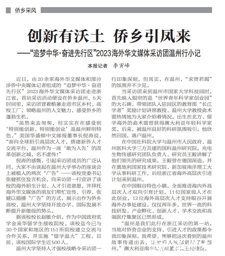 近日,由20余家海外华文媒体和部分涉侨中央媒体记者组成的“追梦中华·奋进先行区”2023海外华文媒体采访团走进浙江省,首站采访活动便设在侨乡温州。5天时间里,采访团冒着酷暑走进市区乡村、高校工厂,领略温州的人文魅力,感受侨乡的蓬勃生机。