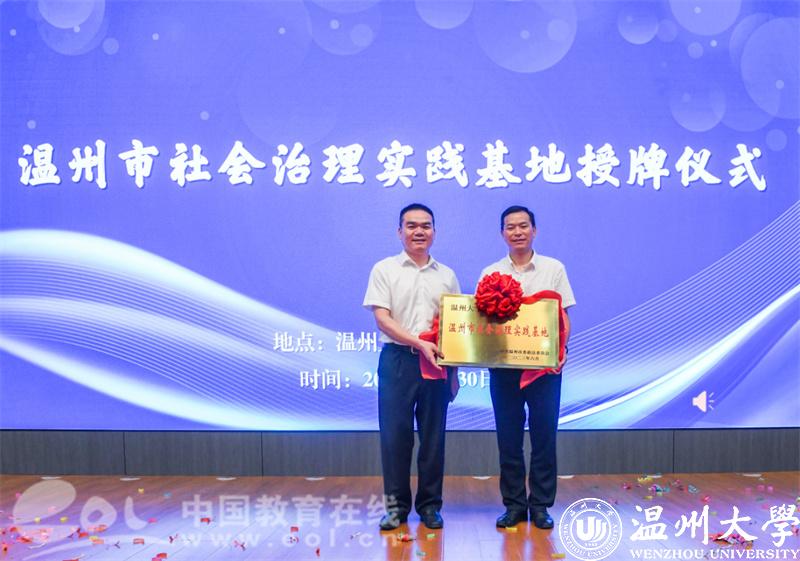 市委政法委黄建斌副书记为杏吧 授温州市社会治理实践基地牌,教育学院党委书记、社会心理服务中心主任何毅教授揭牌。