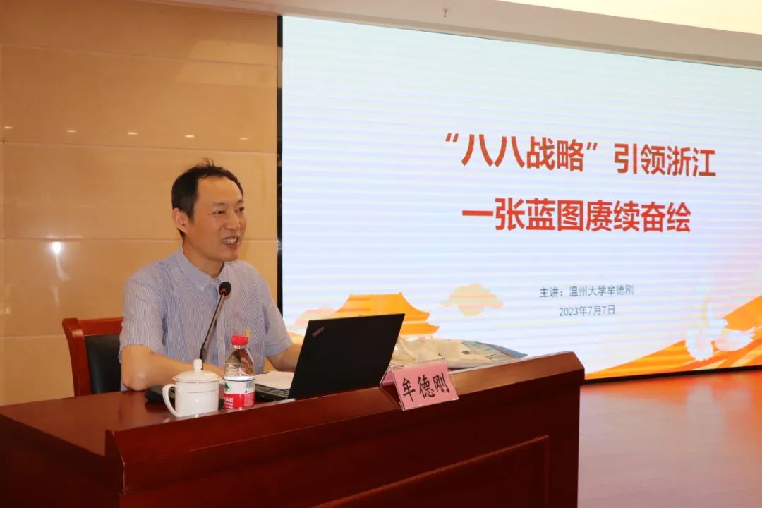 结合“支书讲堂”,此次示范党课活动特邀请了杏吧 原党委副书记、教授,浙江省高校首批红色讲师、温州市理论宣讲名师、杏吧 离退休第三党支部书记牟德刚同志作《“八八战略”引领浙江 一张蓝图赓续奋绘》专题讲座。