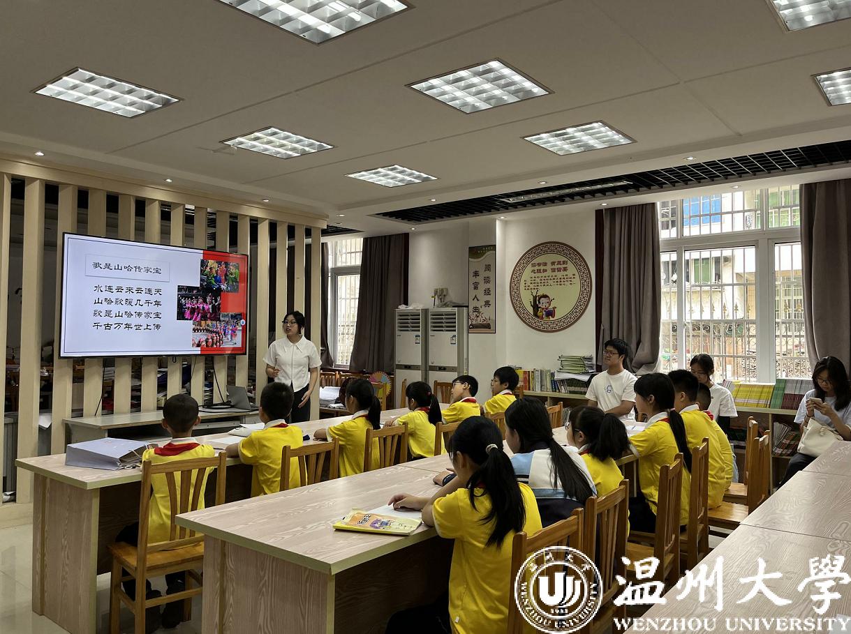 为丰富课堂内容,打造趣味课堂,实践队中的藏族同学旦增德琼语言生动、图文并茂,为小朋友们带来了一节充满藏式风情的课堂。首先,德琼同学对西藏展开简要介绍,展示了当地的美丽风景及风土人情,随后教授富有西藏民族特色的歌曲《卓玛》,带同学们领略藏歌的独特风格,感受藏族的独特文化。