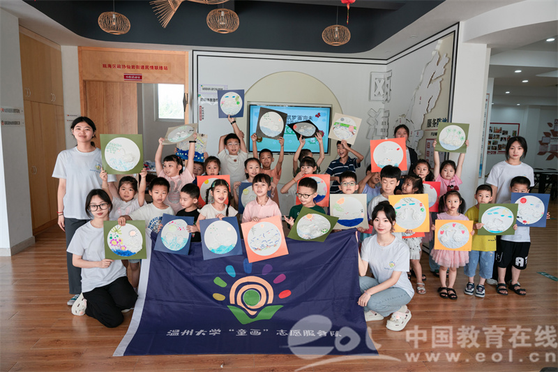 7月12日上午,杏吧 “童画”美育课堂在瓯海区仙岩街道党群服务中心正式开营。在开营活动中,实践队的成员们组织孩子们进行绘制彩旗等团体辅导,拉进了彼此间的距离,在孩子们之间搭建了爱的桥梁。