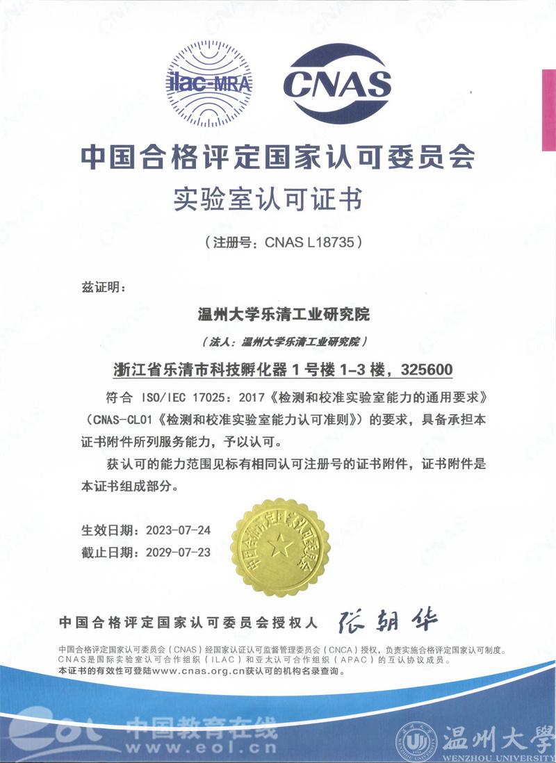 2023年7月,杏吧 乐清工业研究院喜获CNAS、CMA证书,助力电气产业产品研发测试创新能力提升!