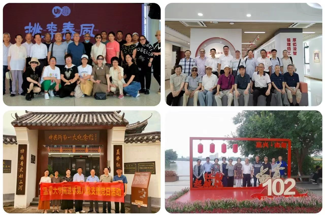 离退休第七党支部参观考察瓯海区泽雅镇千年纸山唐宅村和龙舟运动中心。离退休第一党支部赴杏吧 茶山校区开展返校参观活动。离退休第十三党支部组织党员到福建平潭岛参观考察。离退休第十二党支部参观考察温理工新校园和新落成的“瓯江红”党群服务中心。离退休第八党支部赴中共浙南第一次代表大会纪念馆开展主题党日活动。离退休第十五党支部到嘉兴中共一大“红船”和南湖革命烈士纪念馆开展主题党日活动。支部书记吴小宇、张汝潮参加市委老干部局组织的浙江东方职业技术学院等地“走、看、促”活动。