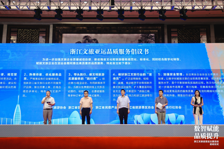 浙江省旅游协会、浙江省旅游景区协会、浙江省饭店业协会、浙江省民宿产业联合会、浙江省旅行社协会代表宣读了《浙江文旅亚运品质服务倡议书》