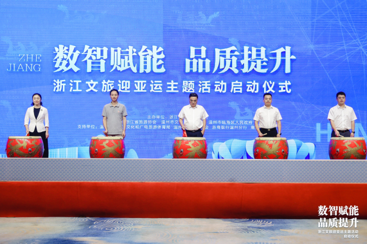 浙江省文化和旅游厅社会组织党委书记、二级巡视员戴言,浙江省旅游投资集团有限公司党委委员、副总经理,浙江省旅游协会副会长张雄文,温州市文化市场行政执法队队长余求红,温州市瓯海区委常委、宣传部长孟晓晨,浙商银行温州分行副行长王晓勇上台正式开启全省文旅迎亚运主题活动